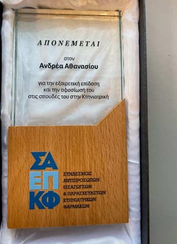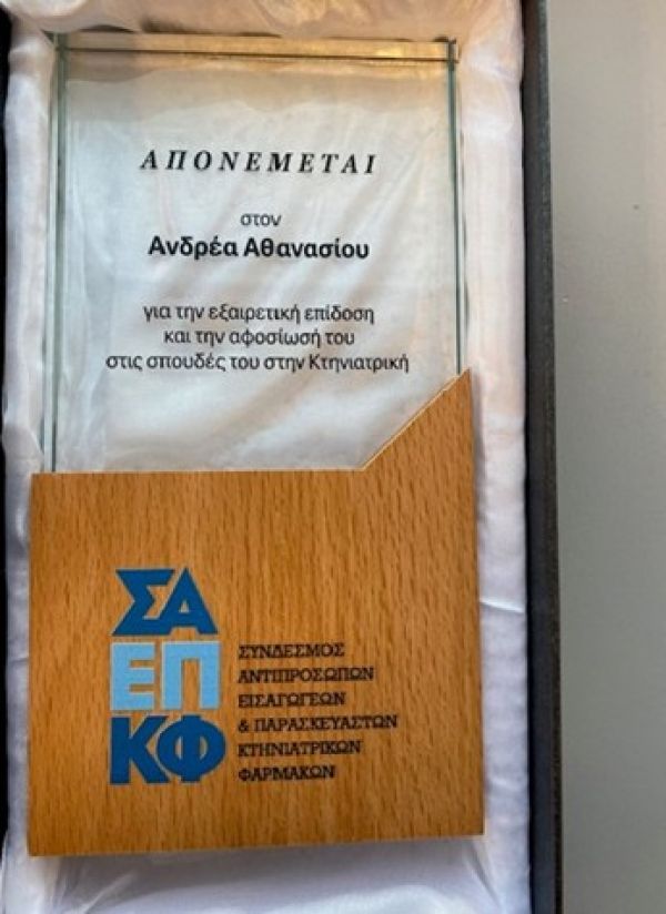 Θα θέλαμε να ενημερώσουμε ότι σε μια πολύ ωραία εκδήλωση που έλαβε χώρα την 18η Φεβρουαρίου 2025 στις εγκαταστάσεις του Τμήματος Κτηνιατρικής του Αριστοτέλειου Πανεπιστημίου Θεσσαλονίκης, παρουσία του Προέδρου του Τμήματος Κου Φορτομάρη, του Διδακτικού προσωπικού και φοιτητών, απενεμήθη από τον Πρόεδρο του ΔΣ του Συνδέσμου Αντιπροσώπων Εισαγωγέων & Παρασκευαστών Κτηνιατρικών Φαρμάκων Κο Κολοβέα Θεοχάρη και επισήμως η υποτροφία που θέσπισε πρόσφατα ο Σύνδεσμος, στον αριστεύσαντα για το έτος 2024 προπτυχιακό φοιτητή του Τμήματος Κο Ανδρέα Αθανασίου. Η υποτροφία συνοδεύτηκε από το ποσό των 3.000 euro.